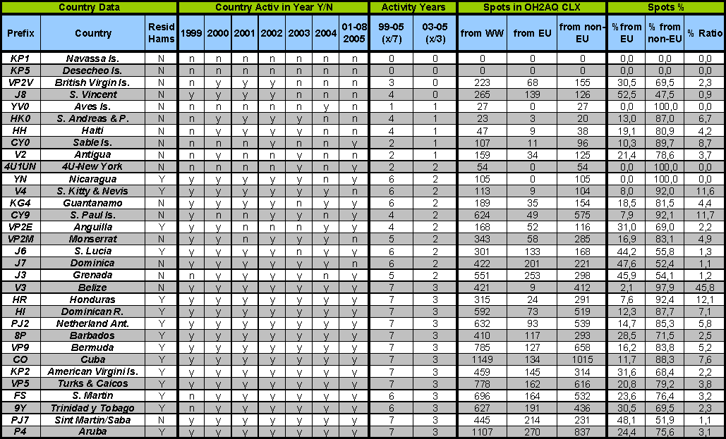 Sergio, IK0FTA - Antonio, I0JX - Stefano, I0WTD - Andrea, N5KME (we thank Trev, G3ZYY and the UKSMG for the assistance in the English version) Waiting for the forthcoming "2005/6 SixItalia Most Wanted Country on 6m" poll we have prepared a little survey hoping it will be useful for those enthusiastic operators organizing DXpeditions to the Caribbean area. We haven't considered all the possible countries but if you have any plans to organize a DXpedition in a country not listed in our work, you are welcome to send us an email and we'll prepare an amendment for you. You can write to: ik0fta@sixitalia.org