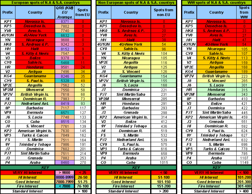 YN, V2, KG4. Going into more detail, and focusing on what would be preferred for EU, using the QRB-EU table we can find that the best choices (for European hams) would exclude YN, HR, V3 and HK0 because they are so far away from the old continent that they would offer only few opportunities to realise a reasonable number of QSO in the Es period. Consequently, following the assigned number of stars, we can eventually compile the 'Top Ten', North American and Caribbean most wanted countries on 50MHz from EU as (in descending order): CY0, CY9, 4U1UN, V2, V4, YV0, KP5, HH, KP1 and KG4. For these countries the average distance from EU is quite good and the activations, during the past years, have achieved a medium or low number of contacts. Our recommendation would be: "please go there". Good DX on Six! Sixitalia Team - IK0FTA, I0JX, I0WTD, N5KME