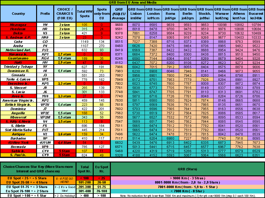 This last table provides an indication of the feasibility of the listed DX countries of EU interest, this time computed for several different European country capitals. Combining the average distance and the interest of the country, an evaluation of 'how fun could be a DX-pedition here' has been attempted, giving stars to each entry. The way stars have been computed depends on interest, related to number of EU spots (left side of bottom table 3) minus a "criticality" figure, provided by the range of the country (i.e. the further, the more critical).